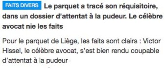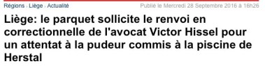 (1) DH et LB du 13 septembre 2017. Voici le texte:   L’avocat était accusé par une jeune femme d’avoir commis deux attentats à la pudeur. Me Victor Hissel, 61 ans, a été acquitté par le tribunal correctionnel de Liège pour deux préventions d’attentats à la pudeur qu’il était accusé d’avoir commis à la piscine d’Herstal en région liégeoise. Me Hissel niait avec véhémence. Cela faisait environs 25 ans que Me Hissel se rendait dans cette piscine. La plainte a été déposée le 20 mars 2016. Après son inculpation pour détention d’images pédo-pornographiques, Victor Hissel n’a plus fréquenté la piscine avant d’y retourner avec un ami proche. Ce dernier était présent le jour où la jeune fille a accusé Victor Hissel. La jeune fille a déclaré que Victor Hissel lui avait palpé la fesse dans le bassin. Selon elle, environ un an auparavant, le même nageur, identifié par la suite comme étant Victor Hissel, lui aurait touché la fesse et le sein de manière très appuyée. Le tribunal a estimé qu’il existait un doute et a donc acquitté Me Hissel.(Sarah Rasujew)