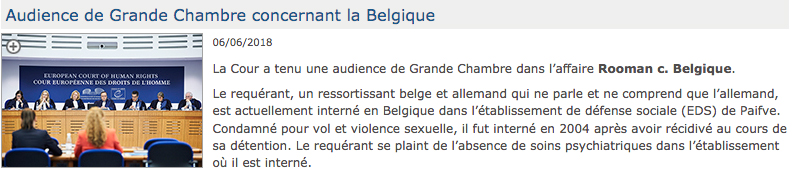 La Cour européenne des droits de l’homme vient, par arrêt de ce 18 juillet, de condamner la Belgique dans une cause où un condamné belge, M. Rooman, d’expression germanophone, interné dans un centre de défense sociale depuis des années, a été et est maintenu dans l’impossibilité de recevoir des soins psychiatriques dans la seule langue nationale qu’il comprend.